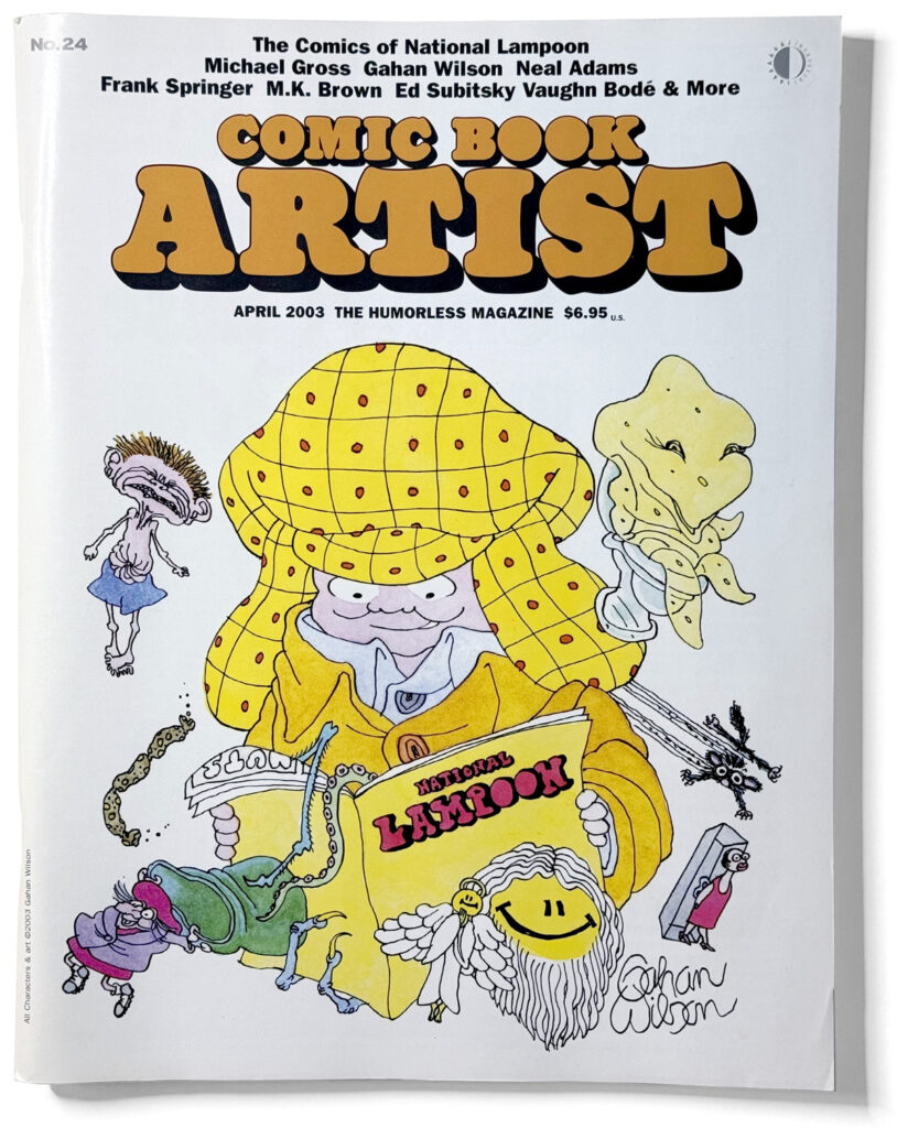 And so, the special issue of Comic Book Artist, The Comics of National Lampoon, was finally published in early 2003, with Gahan Wilson himself doing the cover illustration. It featured interviews with Michael Gross, Gahan Wilson, Alan Kupperberg, Neal Adams, Frank Springer, M.K. Brown, Ed Subitzky, and Mark Bodé (son of the late Vaughan Bodé). (I also did the National Lampoon-style logo treatment for the cover, and provided high-quality scans of covers and other stuff for the issue.)